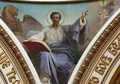 - По оригиналу Ф. П. Брюллова. Мозаика второго яруса главного иконостаса. Мозаичисты: А. Н. Фролов, Е. Г. Солнцев и М. П. Муравьёв.