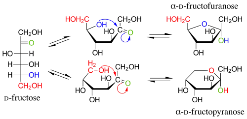 В твёрдом состоянии и в растворах фруктоза существует не в линейной форме, а в виде циклического полуацеталя, образованного в результате присоединения ОН-групп при атоме С-5 или С-6 к кетогруппе. Этот полуацеталь устойчив: в растворе доля открытоцепной формы составляет лишь 0,5 %, тогда как остальные 99,5 % приходятся на циклические формы. Если в циклизации участвует гидроксильная группа при С-5, образуется пятичленный цикл, который называется фуранозным (от названия фурана — пятичленного гетероцикла с одним атомом кислорода), а циклическую D-фруктозу называют D-фруктофуранозой. Если циклизация происходит за счёт гидроксильной группы при C-6, образуется шестичленный, пиранозный цикл (от названия пирана), а такая циклическая D-фруктоза называется D-фруктопиранозой[6].