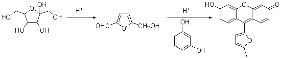 При нагревании твёрдой фруктозы или её насыщенного раствора приводит к дегидратации и образованию продуктов конденсации. Нагревание в присутствии аминокислот приводит к окрашенным и пахучим продуктам реакции Майяра. При нагревании в присутствии кислоты также происходит дегидратация и образуется 5-гидроксиметилфурфурол. Это свойство является основой для качественной реакции на фруктозу — пробы Селиванова[14].