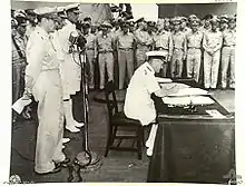 ![]() Адмирал Брюс Фрэзер на борту линкора «Дюк оф Йорк», Гуам 1945 год | |