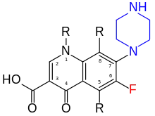 В 1960-х годах была обнаружена высокая антимикробная активность налидиксовой кислоты. Затем была синтезирована оксолиновая кислота, с тем же спектром действия, но более активная (в 2—4 раза in vitro). В продолжение этих работ был синтезирован ряд производных 4-хинолона, среди которых особенно активными оказались соединения, содержащие в положении 6 атом фтора (отмечен на рисунке красным), а в положении 7 (помечено синим) — пиперазиновое кольцо, с дополнительными замещениями, либо без них. Эти соединения были названы фторхинолонами; их можно также назвать хинолонами второго поколения.