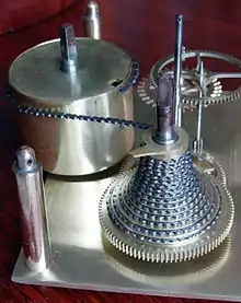 Пружинный двигатель, в отличие от гиревого, имел серьёзный недостаток: крутящий момент, развиваемый заводной пружиной, убывал по мере расходования завода.