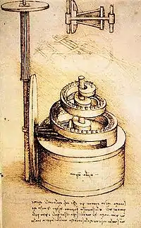 Первые механические часы использовали в качестве источника энергии гиревой двигатель. Он был прост в изготовлении, весьма надежен и обеспечивал высокую равномерность крутящего момента. Гиревой двигатель состоял из приводного барабана, на который наматывался трос, державший металлическую гирю. В абсолютном большинстве случаев вес тросика или цепи, на которых подвешена гиря, можно считать пренебрежимо малым по сравнению с весом самой гири, следовательно, усилие, развиваемое гиревым двигателем, можно считать постоянным за все время работы часов от подъёма на гири на максимальную высоту до её полного опускания.