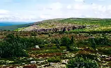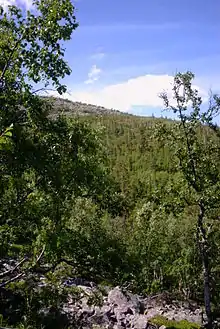 В долине и на склоне горы диабаз содержится в почве в большем количестве, поэтому растительный мир здесь богаче.[S 10] Эта область парка покрыта лесами, где растут некоторые деревья с разной высотой: берёза болотная (Betula pubescens), сосна обыкновенная (Pinus sylvestris) и ель обыкновенная (Picea abies) покрывают площадь размером 4100 га, 3500 га и 5000 га соответственно.[S 12] Меньшие по размерам растения тоже вносят разнообразие в мир флоры. Так, на южном склоне горы можно увидеть шотландские сосны, а их месторасположение сильно напоминает пустошь, с растущими здесь вереском и водяникой.[S 14] Другие представители этих мест — это чаще всего черника, дуб северный, папоротник (Gymnocarpium dryopteris), золотарник обыкновенный (Solidago virgaurea) и так называемая «коровья пшеница» марьянник луговой (Melampyrum pratense).[S 14] Содержащая достаточный процент диабаза почва позволяет расти в этом месте и более требовательные к условиям растения: альпийский синий осот (Cicerbita alpina), герань лесная (Geranium sylvaticum) и аконит северный (Aconitum lycoctonum).[S 14] Парк — очень крупный ареал для почти 2/3 всех видов мхов в стране.[S 10]