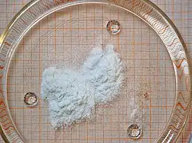 Белый или серый кристаллический порошок. Кристаллы ромбической сингонии, пространственная группа Cmce, параметры ячейки a = 0,53549(2) нм, b = 1,04585(5) нм, c = 0,75579(4) нм, Z = 4[3].