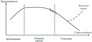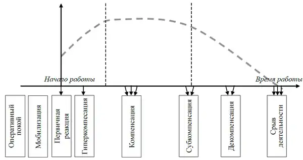 В процессе деятельности происходит изменение уровня работоспособности, описываемое с помощью кривой работоспособности. Впервые, проанализировав так называемую «Кривую работы» Э. Крепелин (1898) выделил 4 основные стадии работоспособности по показателям результативности деятельности[13][16].:
