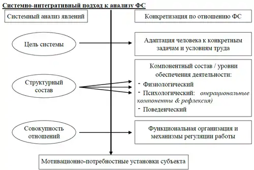 ФС рассматривается как целостная многокомпонентная характеристика проявлений изучаемых психических явлений, в том числе — состояний. На основе многочисленных исследований, проводимых в рамках комплексного подхода, были разработаны новые теоретические конструкты и методические инструменты, подготовившие базу для реализации принципов системного анализа ФС. Однако в целом комплексный подход выступает главным образом как стратегия сбора данных о многоуровневых проявлениях ФС, но не предлагает обоснованной концептуальной схемы для анализа, интеграции и содержательной интерпретации этих многомерных данных. Решение актуальных для практики проблем, связанных с полноценной диагностикой и оптимизацией ФС как сложного системного объекта, было обосновано при разработке структурно-интегративного подхода к анализу ФС[1][2][9].