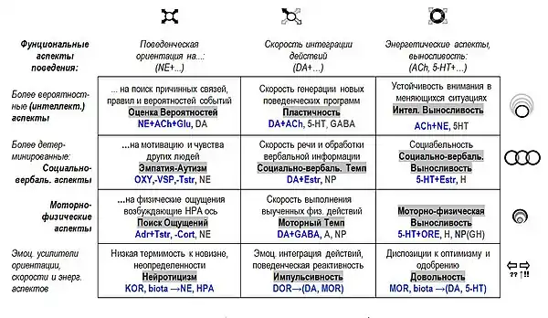 Функциональный Ансамбль Темперамента (FET) – это название нейрохимической модели, систематизирующей нейрохимические биомаркеры черт темперамента здоровых людей и в поведении при психопатологии [1][2][3][4][5]. Модель основана на обзоре литературы в области нейрохимии, психофармакологии, эндокринологии и наркологии и классифицирует роли основных нейромедиаторов, опиоидных рецепторов и нейропептидов в регуляции универсальных функциональных аспектов поведения.