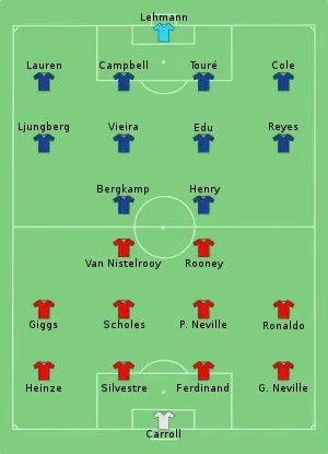 В упорном противостоянии зрители не увидели забитых голов до 72-й минуты матча, но затем Уэйн Руни упал в штрафной площади «Арсенала» после столкновения с Солом Кэмпбеллом. Главный арбитр матча Майк Райли назначил пенальти, хотя Кэмпбелл утверждал, что нарушения с его стороны не было[6]. Руд ван Нистелрой реализовал одиннадцатиметровый удар, а Руни забил второй гол в этой встрече на 90-й минуте.