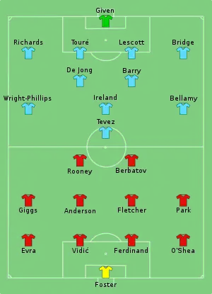 Робиньо (икроножная мышца), Майкл Джонсон (пах), Венсан Компани (голень) и Роке Санта Крус (колено) не попали в заявку «Сити» из-за травм. Также за «Манчестер Сити» не смог сыграть лучший бомбардир команды Эммануэль Адебайор, получивший обвинение в агрессивном поведении в игре против «Арсенала» и отбывающий трёхматчевую дисквалификацию, которую «Сити» не стал оспаривать[45]. Адебайора в стартовом составе «Сити» заменил Карлос Тевес, участие которого было под вопросом из-за травмы, но в итоге аргентинец смог выйти на поле. За исключением замены Адебайора на Тевеса «Сити» выставил тот же состав, что и в предыдущей игре против «Арсенала»[44].
