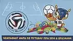 - Финальный турнир 20-го чемпионата мира по футболу FIFA (порт. Copa do Mundo FIFA de 2014, англ. 2014 FIFA World Cup) прошёл на стадионах Бразилии с 12 июня по 13 июля 2014 года — Бразилия стала пятой страной, принимающей чемпионат мира во второй раз. На официальных коммеморативных марках России «Чемпионат мира по футболу FIFA 2014 в Бразилии™» изображён официальный мяч чемпионата мира по футболу FIFA 2014 (Brazuca), талисман броненосец Фулеко (Fuleco) на фоне схемы футбольного поля. (Дизайн Brazuca является зарегистрированным торговым знаком компании «Адидас Груп», используется с её разрешения). Формат блока — 107х60 мм, формат марки — круглая, диаметром 33 мм[24].