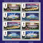 - Матчи Чемпионата мира по футболу FIFA 2018 в России™ пройдут на 12 стадионах 11 городов России. Следующие четыре марки серии посвящены стадионам в Волгограде, Екатеринбурге, Ростове и Самаре. Марки напечатаны на малых марочных листах: формат марочного листа — 154х154 мм; формат марки — 65х32,5 мм; тираж каждой марки — 400 000 экземпляров (200 000 малых марочных листов). Количество марок на листе — 8 (2х4), каждая марка напечатана на листе дважды[37].