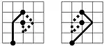 - Основной ход состоит из одного звена — по сторонам клетки или по диагоналям. Звенья могут пересекаться, но не могут полностью совпадать (идти по одному отрезку). Далее возможны варианты: