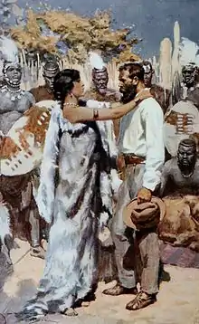 Реальная обстановка была менее идиллической: в 1876 году произошло резкое ухудшение отношений основанной бурами республики Трансвааль с зулусами и вождём басуто Секокоени. Госсекретарь по делам колоний лорд Карнарвон распорядился провести расследование причины трений, а также изыскать возможность для аннексии зулусских и бурских территорий. Разведывательную группу возглавил сэр Теофилиус Шепстоун, который, прибыв в Наталь, взял в свою небольшую команду и Хаггарда. Сэр Бульвер сначала отказал, однако Шепстоун настоял на своём; судя по письмам Хаггарда родителям, он показал свою полезность при устройстве официальных приёмов, и предполагалось, что его способности пригодятся в Претории. Отбыв из Марицбурга в конце декабря 1876 года, группа Шепстоуна прибыла в трансваальскую столицу 22 января. Из приданных ему вооружённых сил сэр Теофилиус взял только 25 конных полицейских, а большая часть батальона стояла на границе, обеспечивая авторитет посланника. Для Хаггарда это было приключением, первым настоящим путешествием по Африке; о сущности миссии Шепстоуна, он, вероятно, не задумывался. Он тщательно фиксировал историю короля Кечвайо и познакомился с 60-летним воином-свази, которого именовал «Умслопогас» — под этим именем тот затем вошёл в серию романов об Алане Квотермейне[15].