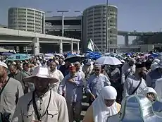 - Облачение в ихрам. Пройдя микат (это специальные места, обозначающие границу территории, внутрь которой верующие, с разных концов света (афак) прибывающие в Харам-и Шариф, не могут пройти, не войдя в состояние ихрам), мусульманин совершает молитву и произносит особое обращение к Аллаху (тальбийа): «Вот я перед Тобой, Господи! Нет у Тебя сотоварища! Вот я перед Тобой! Воистину, хвала Тебе, милость и могущество! Нет у Тебя сотоварища!» С этого момента считается, что он вошёл в состояние ихрама.