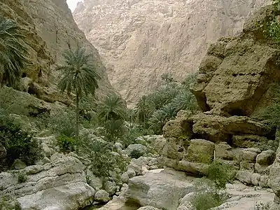 Склоны гор Хаджар отвесны и образуют каньоны и обрывы высотой до 1000 м. От морского побережья вглубь горного массива уходят долины-вади, среди которых следует назвать Тиви, Шааб (от северо-восточного побережья) и Бани-Халид (с юга), в которых текут реки, наполняющиеся водой в зимний период. Горные ручьи Шааб и Бани-Халид образуют настоящие пресноводные озёрца, которые можно достичь, даже путешествуя по их долинам пешком. Кроме них, горы пересекают и другие вади, которые наполняются водой в период дождей.