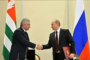 24 ноября 2014 года Путин и Хаджимба подписали в Сочи Договор о союзничестве и стратегическом партнёрстве сроком на 10 лет, согласно которому создаётся общее оборонное пространство и совместная группировка войск, с перспективой полной военно-политической интеграции двух государств. Россия значительно, до 5 млрд руб. в год, увеличивает финансовую помощь Абхазии, включая социальные выплаты и пенсии[58]. В январе 2015 года Госдума РФ ратифицировала этот договор[59].