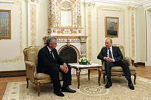 27 августа 2014 года Хаджимба встретился в подмосковной резиденции Ново-Огарёво с президентом РФ Владимиром Путиным, обсудил с ним заключение нового договора о дружбе и сотрудничестве между Россией и Абхазией. В договоре должно быть предусмотрено создание общего пространства обороны и безопасности, открытие российско-абхазской границы[56]. 13 октября 2014 года проект договора, который комментаторы оценили как шаг к политическому и оборонному единению Абхазии и России, был опубликован для всеобщего обсуждения[57].