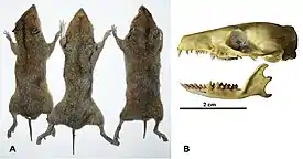 Длина тела составляет 13,2—14,7 см, хвоста — 3,6—4,3 см[5]. Вес 50—70 г[6]. Мех красновато-коричневый на верхней стороне и с чёрной полосой на спине, нижняя сторона тела более светлая, в основном светло-серая или желтоватая. Морда гибкая и удлиненная и служит для поиска пищи в земле.