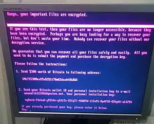 Однако, несмотря на достаточно высокий уровень реализации самого вируса, его разработчики воспользовались крайне уязвимым и ненадёжным способом общения с жертвами, что создаёт впечатление, что вымогательство не было основным мотивом[17]: всем жертвам предлагается перечислить биткойны стоимостью $300 в кошелёк автора вируса и передать указанный на экране длинный код на указанный адрес электронной почты.