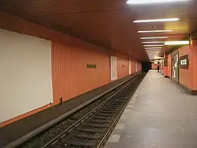 Колонная двухпролётная станция мелкого заложения, сооружена по типовому проекту. Архитектор — Райнер Г. Рюммлер. Путевые стены отделаны оранжево-красными панелями из этернита. Колонны и потолок — оранжевыми металлическими пластинами. Аналогично оформлена соседняя станция «Якоб-Кайзер-Плац». Единственный выход расположен в центре платформы.