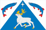 Прямоугольное полотнище белого цвета с отношением ширины к длине 2:3, со вписанным лазоревым острием, обремененное бегущим оленем в цвет поля с золотыми рогами и копытами и пурпурными глазами и языком, и над ним - серебряной восьмилучевой звездой. По сторонам острие сопровождено двумя лазоревыми сообращенными и выгнутыми в стороны щуками с пурпурными глазами и плавниками. Обратная сторона зеркально воспроизводит лицевую.