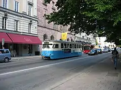 ![]() Трамвай Дьюргорденской линии проходит перед дворцом Халлвил | |
