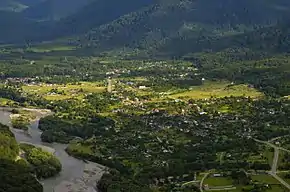 Расположено в живописной долине реки Белой. Со всех сторон окружено высокими горными хребтами. Через село проходит шоссе на Гузерипль.