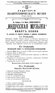Хазрат достиг России 3 октября 1913 года и прожил в ней семь месяцев. В Москву он прибыл из Парижа со своими тремя братьями-музыкантами. Целью его приезда была организация концертов и лекций-демонстраций индийской музыки. Первые концерты индийской классической музыки прошли в кабаре «Максим»[4]. Для привлечения публики владелец кабаре Ф. Ф. Томас приглашал музыкантов со всего света[5]. Пригласил он и прославившегося в Париже Инайят Хана. Инайят Хан скоро установил дружбу с композитором и музыкантом С. Л. Толстым (сыном Льва Толстого), с поэтом Вячеславом Ивановым, с педагогом Императорской консерватории певицей Е. А. Лавровской, с актрисой театра и кино Лидией Дмитриевной Рындиной[6]. Они «открыли» Инайят Хана московским музыкальным кругам. Необычная музыка, прекрасное исполнение, обаяние человека красивого, образованного, обладающего к тому же «особым» знанием, — всё это привлекло к нему многих людей, в том числе у него завязывается дружба с педагогами Императорской консерватории, с певицами Александрой Святловской и Ольгой Такке (Тарской).