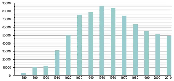 Население города по возрастному диапазону распределилось следующим образом: 18,0 % — жители младше 18 лет, 7,4 % — между 18 и 21 годами, 59,4 % — от 21 до 65 лет и 15,2 % — в возрасте 65 лет и старше. Средний возраст населения — 35,4 лет. На каждые 100 женщин приходилось 94,7 мужчины, при этом на 100 совершеннолетних женщин приходилось уже 91,2 мужчин сопоставимого возраста[6].