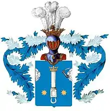 В щите, имеющем голубое поле в верхней левой части изображена выходящая из облаков рука, облечённая в латы с саблей (польский герб Малая Погоня), и между двух золотых восьмиугольных звёзд, виден серебряный столб (польский герб Першхала) перпендикулярно на подкове поставленный (польский герб Ястржембец), имеющий на поверхности своей золотую корону.