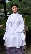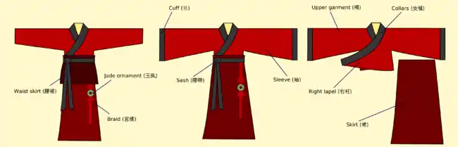 Общие характеристики ханьфу: перекрёстный воротник (交領) и правый отворот (右衽, запахивать полу одежды направо).