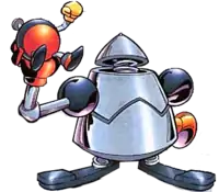 ![]() Хеви и Бомб в комиксах «Sonic the Hedgehog» Хе́ви (англ. Heavy) и Бомб (англ. Bomb) — два робота, появлявшиеся только в игре Knuckles' Chaotix. По сюжету этой игры, Хеви и Бомб — одни из машин Доктора Роботника, которые сумели сбежать из под его контроля и в дальнейшем старались оказывать помощь команде Хаотикс. Хеви — это большой и медлительный робот с серебристым покрытием, служащий у Роботника главным механиком. Бомб, под стать его названию, представляет собой бомбу с красно-чёрным корпусом, имеющую руки и ноги. В Knuckles’ Chaotix один из этих роботов может присоединиться к игроку как бонусный партнёр. Хеви неуязвим для противников и может уничтожать их простым касанием, однако из-за своего веса он медленно передвигается и не способен высоко прыгать. Бомб, при своей малой величине, передвигается быстро и прыгает достаточно высоко. Будучи бомбой, этот робот взрывается при малейшем повреждении, но этот взрыв может задевать одновременно нескольких противников, а Бомб способен восстанавливаться после него почти сразу же. После победы игрока над Роботником на уровне «Newtrogic High Zone» Хеви и Бомб исчезают и больше в игре не появляются. После игры Knuckles' Chaotix Хеви и Бомб фигурировали только в серии комиксов Sonic the Hedgehog. Впервые они появились там в четвёртом спецвыпуске под названием «Knuckles’ Chaotix», где опять же состояли в команде Хаотикс и раскрыли факт о магических камнях, из которых черпал силу Доктор Роботник. В дальнейшем, Хеви и Бомб неоднократно участвовали в сюжете комикса, но уже в качестве отрицательных персонажей. Роботы состояли на секретной службе Короля Акорна, когда на одной из своих миссий были перепрограммированы и стали охотиться за королевской семьёй, а после — за Миной Мангуст. В обоих случаях Хеви и Бомб были повержены Соником и его друзьями. Сейчас состоят в составе Команды Свободы, которая защищает Новый Моботрополис от Короля Иксиса Наугуса. Во время атаки Яйца Смерти, помогли в битве с Метал Соником, Метал Тейлзом и Метал Эми. | |||