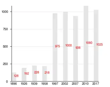 | 1896 | 1926 | 1939 | 1958 | 1997 | 2007[29] | 2010[30] |
