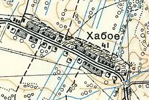 На картах 1910 и 1914 года, так же обозначено Хабое[9][10], а сама деревня вытянулась вдоль дороги между Чёрной Головой и Большим Манушкино.