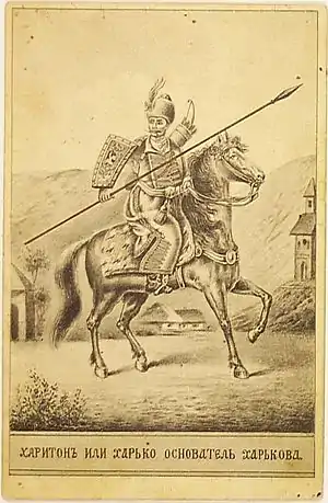 Предлагаются различные даты основания современного города на месте древнего Харьковского городища[28] — от 1630 до 1655 года. В XVIII веке основателем города считался некий мифический казак XVI — начала XVII веков (или даже XVIII века) Харько. Однако уже в XIX веке версия об основании города казаком Харько была отвергнута как безосновательная, так как река Харьков указана в Книге Большому Чертежу, то есть до основания города.