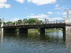 | Заход крестного хода на Купеческий мост. | Хоругвеносцы на мосту через Лопань. | Крестный ход входит в Покровский монастырь. | Православные миряне. |