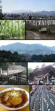 ![]() Сверху вниз, слева направо: Центр города Хатиодзи, парк Комия, парк Наганума, гора Такао, каменный забор и мост у замка Хатиодзи, Храм Якуоин на горе Такао, рамэн Хатиодзи, фестиваль Хатиодзи | |||||
