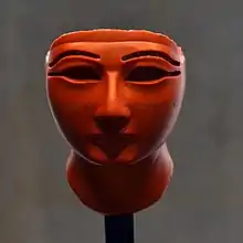 ![]() Известняковая сидячая статуя Хатшепсут в Метрополитен-музее, Нью-Йорк. Царица изображена без накладной бороды, но с символами власти фараона: головной убор немес, увенчанный царским уреем. | |