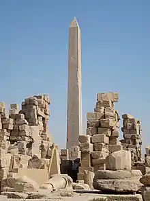 Здесь же, в Карнаке, по приказу царицы были установлены гигантские гранитные обелиски, воздвигнут VIII пилон в храме Амона, сооружено святилище Амона-Камутефа, значительно расширен храм супруги Амона — богини Мут. Она установила четыре гигантских обелиска, два из которых были помещены между пилонами Тутмоса I. Два обелиска Хатшепсут (высотой 29,56 м) рядом с пилоном храма Амона-Ра в Карнаке были самыми высокими из всех построенных раннее в Египте, пока их не заложил каменной кладкой Тутмос III (до наших дней сохранился один из них, цельный блок из красного гранита). При Хатшепсут был вытесан и крупнейший из всех древнеегипетских обелисков, который так и не был закончен, также предназначавшийся для Карнака. Высота его должна была составлять 41,8 метра, а вес — около 1200 тонн[9], что на треть превосходит крупнейшие обелиски, когда-либо возведённые в Египте.