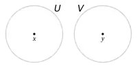 Топологическое пространство называется хаусдорфовым, если любые две различных точки , из обладают непересекающимися окрестностями , .