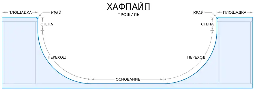 - Основание (или платформа) — центральная нижняя часть хафпайпа.