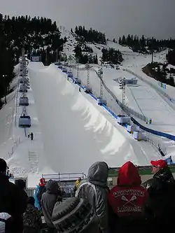 Место соревнований по хафпайпу представляет собой полутрубу, сделанную из плотного снега или вырытую в земле и покрытую снежным слоем. Для создания правильной геометрии и радиуса используется ратрак со специальными насадками. Это сооружение внешне напоминает рампу для скейтборда, высота стенок которой более 3 метров, а длина превышает 80 метров. Его строят на горе с уклоном, поэтому можно с одной стены разогнаться, а с другой вылететь по радиусу, сделать трюк и, вписавшись в тот же радиус, поехать обратно и совершить следующий трюк на противоположной стене.
