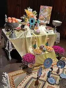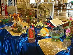 Кроме того, на столе часто присутствуют Святая книга, Шахнаме, сладости, орехи, украшенные яйца, зеркало а также лента или любая композиция из традиционных иранских цветов (зелёный-белый-красный), либо сам флаг.