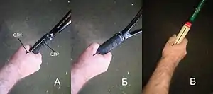 - Имеется ещё одна специальная хватка с углом поворота ракетки минус 40-50 градусов, которая относится к классу хваток «птичкой», но несколько отличается от них. В этой хватке большой палец не только отставляется от остальных, но ещё и жестко упирается в боковую грань ракетки (Рис. 4в). Эта хватка применяется только для одного типа удара — одноручного кручёного (в редких случаях плоского) бэкхеннда. При такой хватке большой палец упирается в боковую грань ракетки для создания жёсткого закрепления ракетки в кисти и противодействия силам отдачам, которые могут выбить ракетку из кисти, так как при одноручном крученом бэкхенде ладонь теннисиста находится впереди ручки и вся отдача приходится на более слабую часть кисти — пальцы.