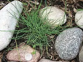 Низкий полукустарничек 5—10 (15) см высотой. Корневище вертикальное, иногда довольно толстое, в верхней части ветвится, каждая из ветвей несет на верхушке пучок радиально отклоненных ассимилирующих побегов. Главный стебель обычно не заметен, в редких случаях он достигает 5—10 см и стелется по земле. Веточки тонкие, около 1 мм диаметром, сизовато-зеленые, тонкобороздчатые, более или менее шероховатые, иногда довольно сильно, на верхушке нередко искривленные или загнутые, состоят из 2—3 (5) междоузлий 1—2 (3) см длиной. Листья супротивные, сросшиеся между собой на ½—⅔ своей длины во влагалища 2—2,5 (3) мм длиной, с короткотреугольными или тонко заостренными зубцами. Чаще всего влагалища полностью темно-коричневые, почти черно-коричневые, изредка между зубцами перепончатые, беловатые; основания их более или менее сильно утолщенные (тогда похожи на мелкие луковички), зона срастания (часто, но не всегда) покрыта по всей длине или только в верхней части беловатыми, позднее белыми матовыми клетками.