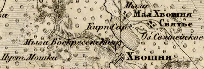 На карте Санкт-Петербургской губернии Ф. Ф. Шуберта 1834 года, у озера Святейского обозначена деревня Хвошня, состоящая из 25 крестьянских дворов и при ней усадьба Воскресенская, а также ещё одна деревня Хвошня и деревня Малая Хвошня[3].