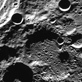 ![]() Снимок зонда Lunar Reconnaissance Orbiter (север слева внизу). В верхней левой части снимка виден участок вала кратера Пласкетт. | |