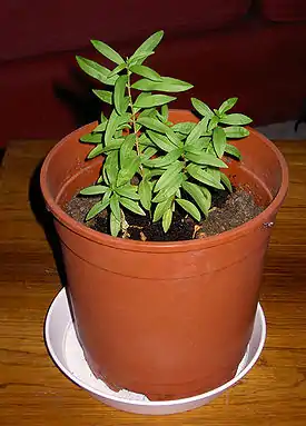 - Куст высотой до 1 м с жёлтыми цветками диаметром 1 см, имеющими по 5 чашелистиков. Листья 5 мм шириной и 2-3 см длиной.