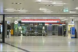 Имеет единственный выход, оснащённый 3 эскалаторами и 2 лифтами. Лифты необычны тем, что движутся по диагонали вдоль эскалаторов, а не вверх-вниз.